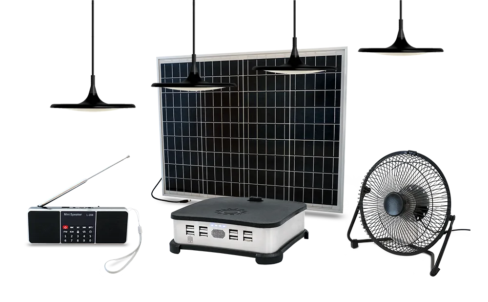 Un kit économique et extensible pour fournir une électrification de base dans les zones hors réseau. Branchez nos lampes LED, lumières de surveillance et chargez jusqu’à sept téléphones à la fois.