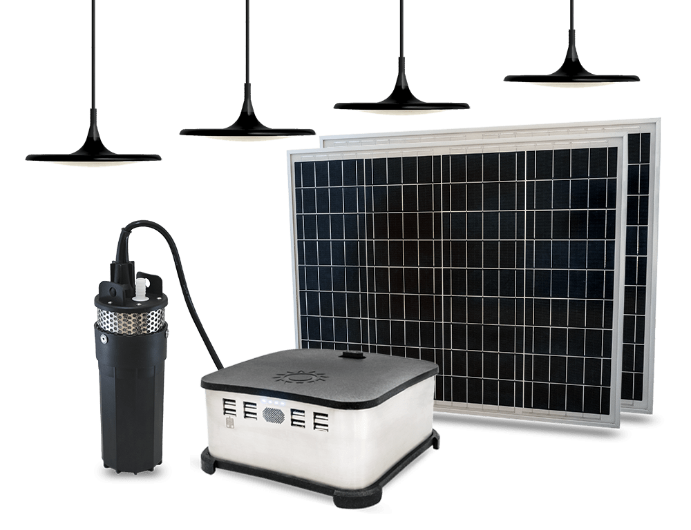 Ce kit vous permet de fournir de l’eau pour les petits élevages de volaille et l’irrigation des champs. Des pompes personnalisées plus grandes peuvent également être installées sur le système à l’aide de convertisseurs DC/DC ou d’onduleurs. Les clients bénéficient d’un éclairage supplémentaire, d’une recharge téléphonique et bien plus encore.