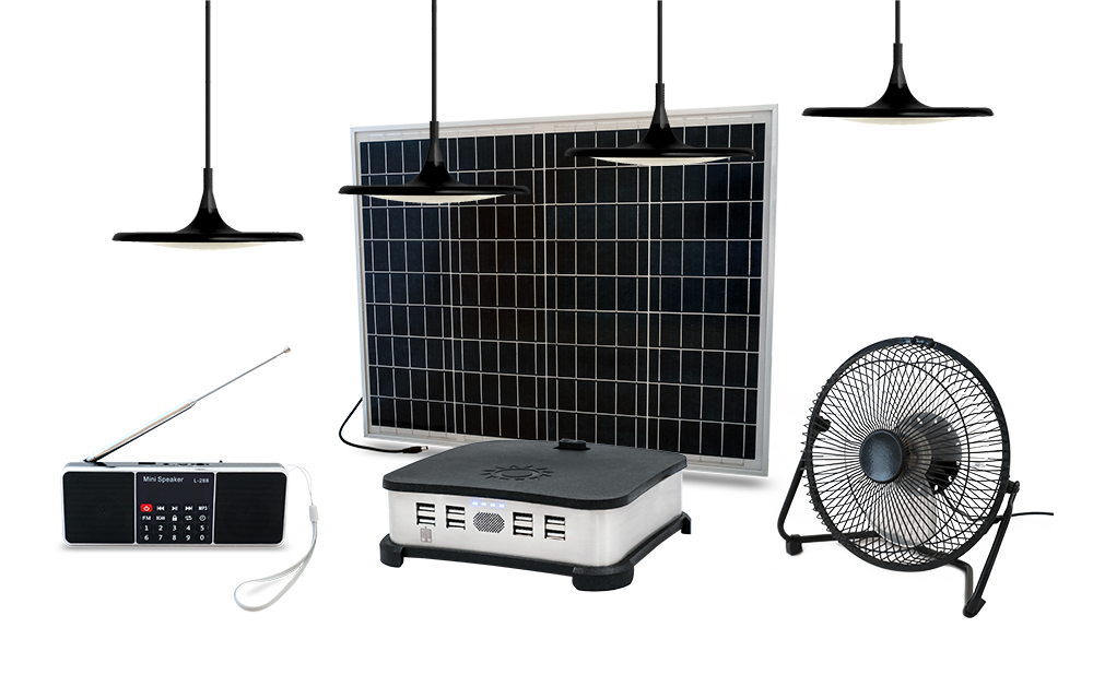 A cost efficient and extendable bundle to provide basic electrification in off-grid areas. Plug-in our LED lamps, security lights and charge up to seven phones at once.