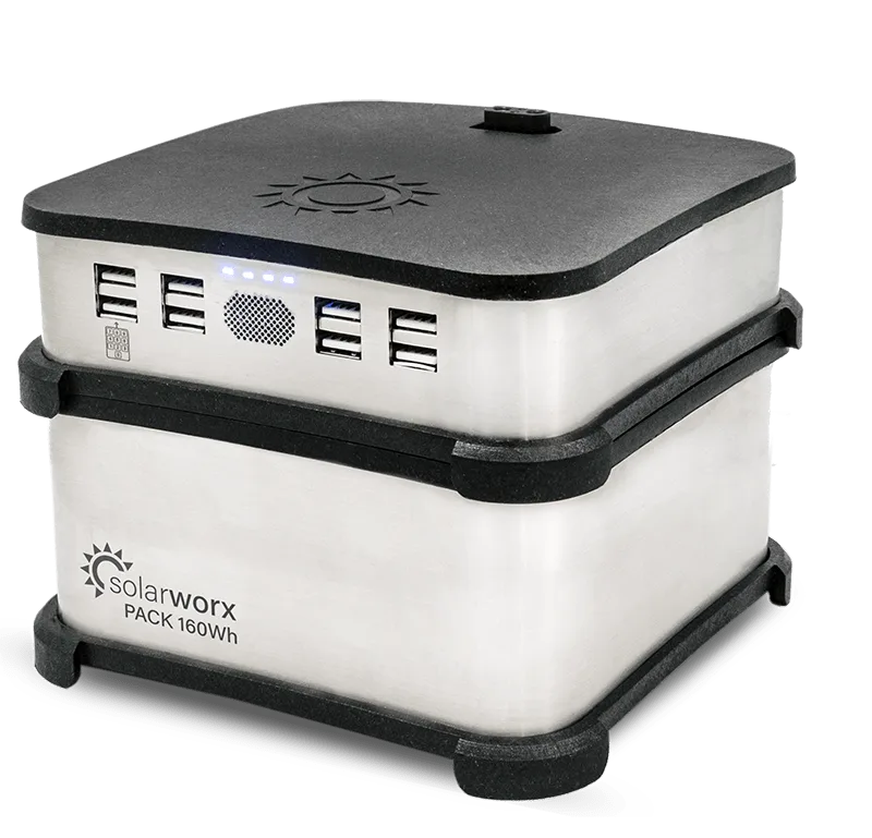 Two different modules of 80Wh and 160Wh can be stacked on top of each other to increase the battery capacity and the maximum power output. Each system includes an MPPT and accommodates up to two 50W solar panels. A battery expansion pack with another 160Wh is also available.